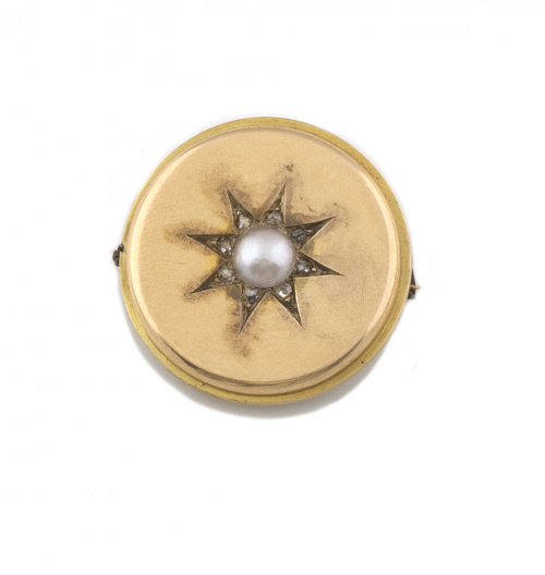 22. Broche circular de pp s. XX con perla fina central y estrella de diamantes .