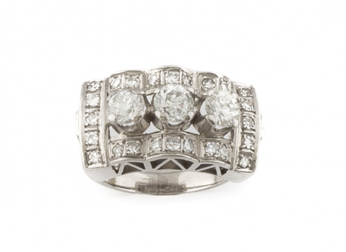 30. Sortija chevalier con tres brillantes en línea central enmarcada por ondas de brillantes.
