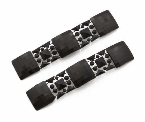 31. Pareja grandes broches rectangulares años 30 con placas geométricas de cristal negro facetado.