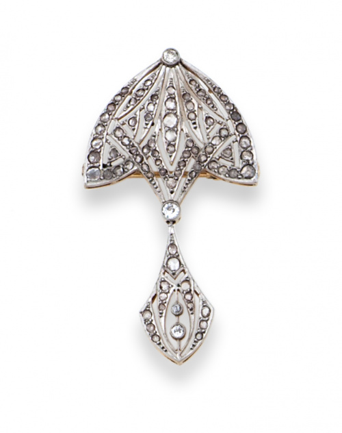 Broche de pp. s. XX con diamantes y brillantes de talla antigua en diseño calado de finas líneas.