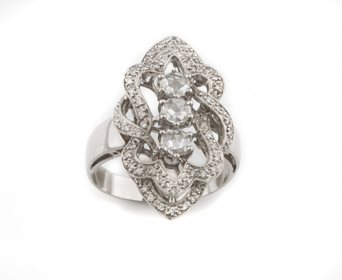 39. Sortija lanzadera con tres diamantes de talla holandesa que suman 0,46 ct y diamantes dibujando cintas entrelazadas.