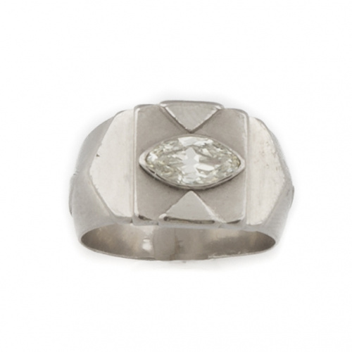 Sortija con diamante talla navette antigua central de 0,65 ct aprox en montura tipo sello de platino con decoración geométrica.