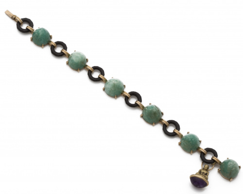 43. Pulsera Art-Decó con cabuchones elevados de cuarzo aventurina alternos con aros de ónix, y remate colgante de buda de oro con base de amatista.