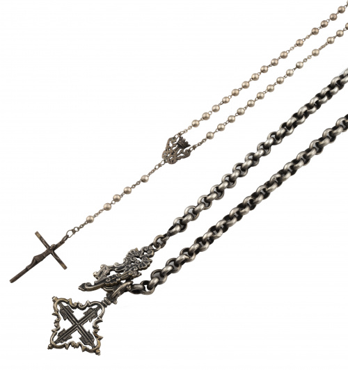 Lote formado por cadena mallorquina de grandes eslabones en plata y rosario de pequeñas cuentas en plata.
