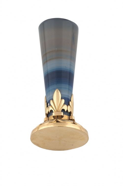 645. Sello para lacre en oro de 18K con mango de columna cónica adornado por flores de lys en base y mango de ágata azul bandeada.