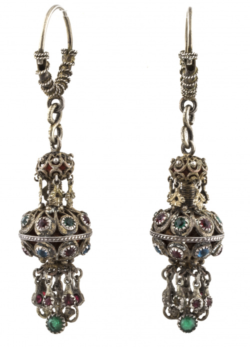9. Pendientes populares de calabaza en plata s.XVIII con aro sogueado y motivos de colores en cuerpo principal y colgantes.