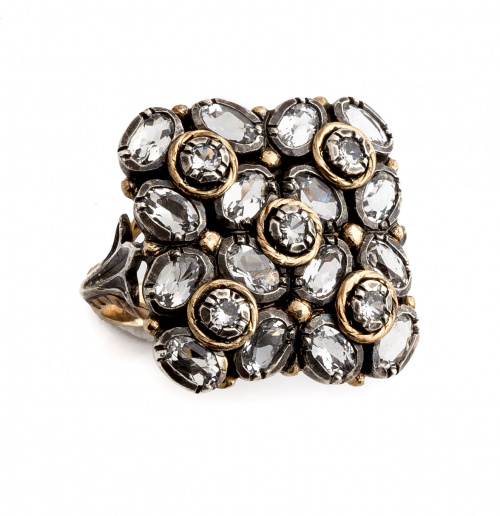 Sortija portuguesa ff. S.XIX con diseño de flores de cristal de roca facetado que componen un cuadrado