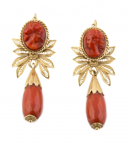 1. Pendientes largos de coral S. XIX con camafeos enmarcados en sogueado, pieza intermedia con hojas de filigrana y perillas colgantes