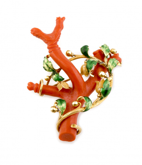 11. Broche de pp. S.XX con rama de coral mediterráneo tallada, rodeada por formas vegetales en oro de 18K brillo y mate y esmalte verde