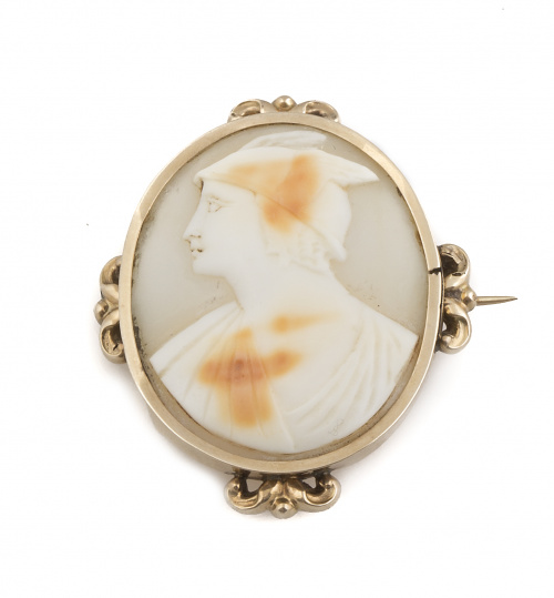 14. Broche de ff.S. XIX con camafeo de busto de guerrero tallado en concha bicolor
