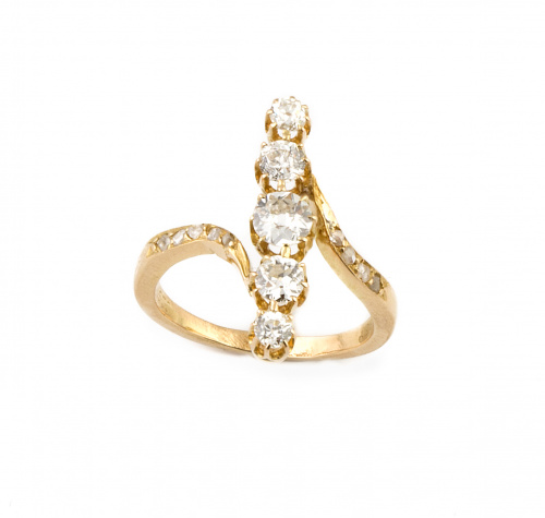 38. Sortija lanzadera con línea de cinco brillantes de talla antigua y diamantes en los brazos de la montura