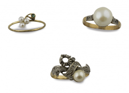 41. Conjunto de tres sortijas con perlas en oro de 18K