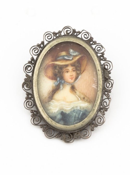 43. Broche colgante con retrado de dama pintado en marco de plata con decoración de espirales
