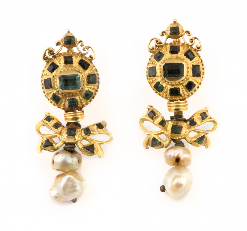 Pendientes S. XVIII-XIX con botón y lazo de esmeraldas y dos perlas de aljófar colgantes