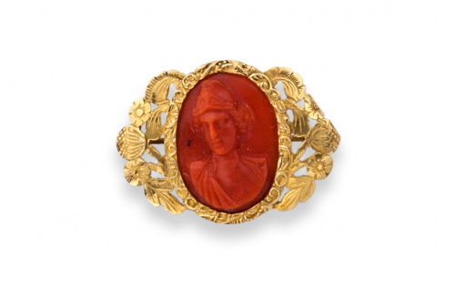 7. Broche S. XIX con camafeo de coral mediterráneo en marco calado y grabado con formas vegetales.