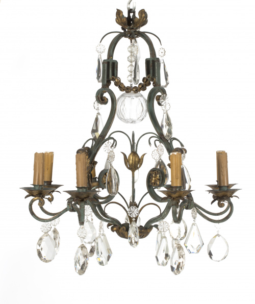 Lámpara de techo de ocho luces en metal pintado de verde y pandelocas de cristal facetado.S. XX.
