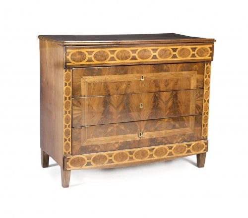 Cómoda Carlos IV en madera de palma de caoba, y marquetería de motivos geométricos en nogal y boj. Trabajo español, pp. del S. XIX.