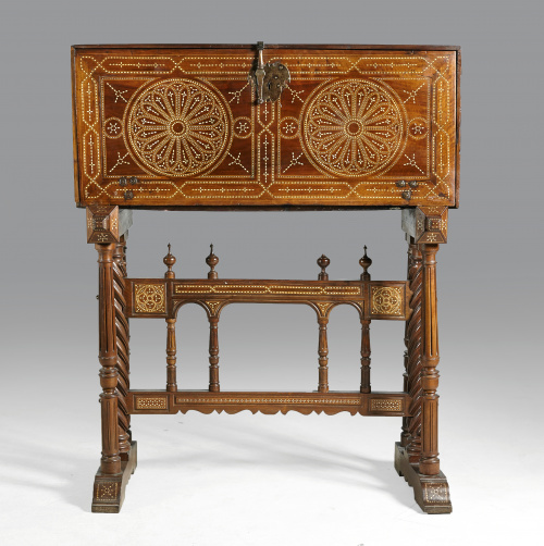 Bargueño sobre mesa de pie de puente en nogal y taracea de hueso.