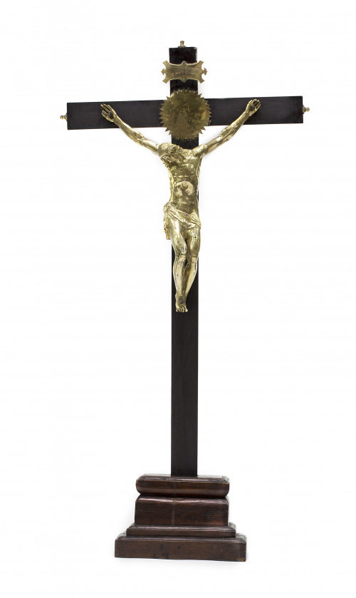 “Cristo crucificado” en bronce dorado sobre cruz de madera ebonizada y base de caoba.Escuela italiana h. 1600..