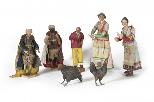 Cinco figuras de belén, de barro cocido y policromado, estopa y ojos de pasta vítrea y un gallo y un pavo de barro policromado y ojos de pasta vítrea.Trabajo napolitano, h. 1800.
