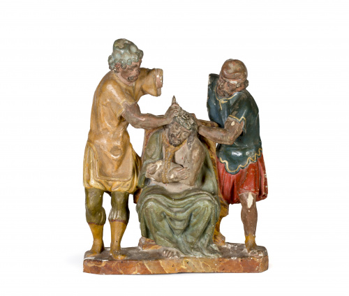 785. “Coronación de espinas”, grupo escultórico en madera de nogal, estucado y policromado.
