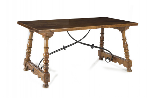 865. Mesa de comedor siguiendo modelos del S. XVII, en madera de haya tallada y torneada con fiadores de hierro.S. XX.