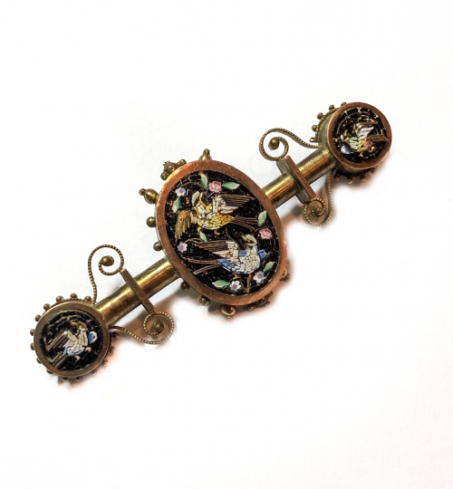 Broche de micromosaico italiano S. XIX con tres motivos ovalados, el central de menor tamaño , que representan aves y flores en piedras duras multicolor