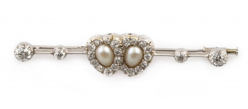 26. Broche victoriano s.XIX con dos corazones unidos de brillantes de talla antigua, con perillas de perlas finas centrales y dos brillantes en chatón a cada lado en el alfiler