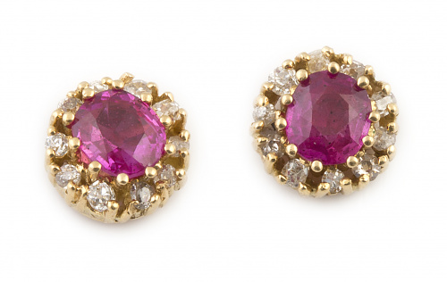 Pendientes con rubíes de talla redonda y 1 ct aprox cada uno,orlados de brillantes de talla antigua