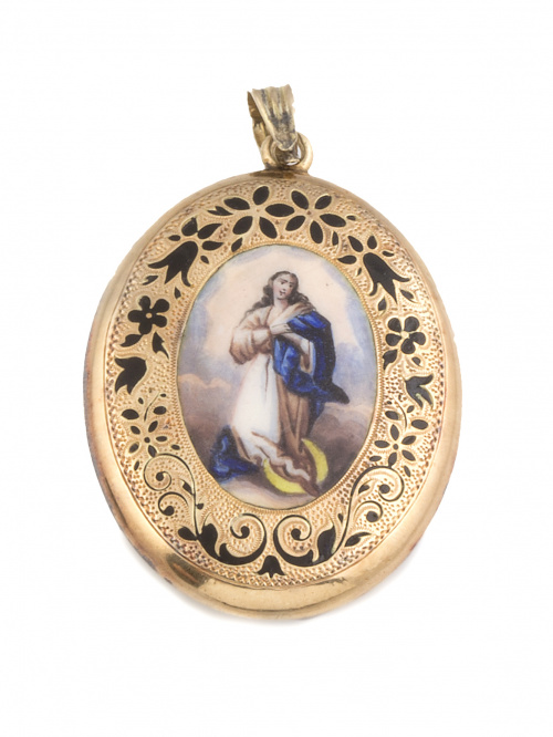 Colgante portafotos s.XIX con Virgen en esmalte polícromo rodeado de guirnaldas grabadas y esmaltadas en negro