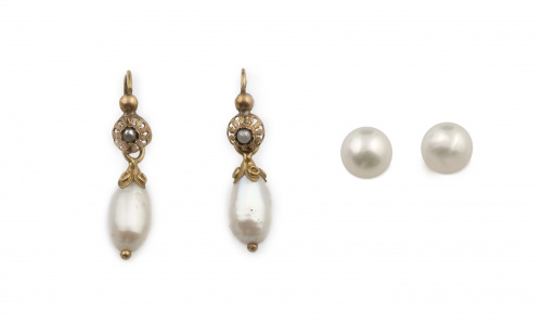 34. Lote formado por pendientes largos con perla barroca colgante, y pendientes de perla mabe en oro de 18K