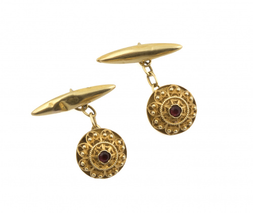 40. Gemelos charros de ff. s.XIX con botones adornados por filigrana de oro y rubí central