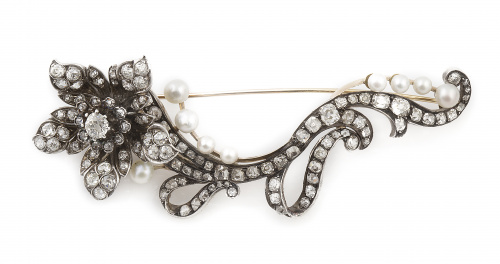 Broche flor s.XIX con brillantes de talla antigua y perlas,probablemente naturales ,con diseño de flor de cinco pétalos y tallo sinuoso