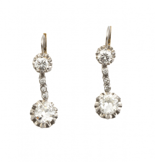 Pendientes largos de brillantes de pp. s.XX ,con brillantes colgantes de 1,20 ct que penden de línea de chatones y brillantes superiores de 0,45 ct