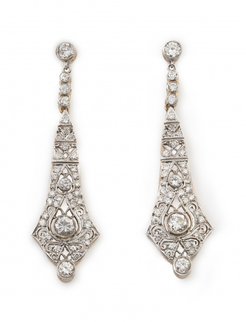 412. Pendientes largos de brillantes estilo Art-Decó de forma acampanada con diseño calado en torno a brillante en chatón central