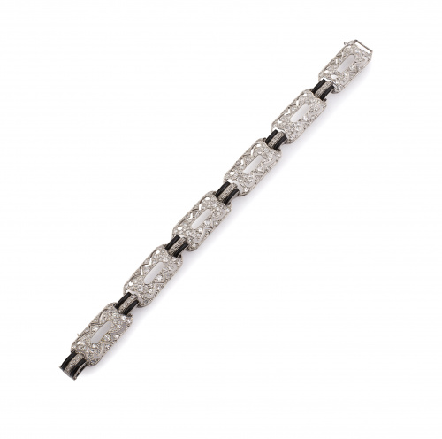 Con seis piezas rectangulares de brillantes con decoración calada articuladas por arcos de ónix y brillantes Peso total aprox btes: 5,5 ct Longitud:17,3 cm