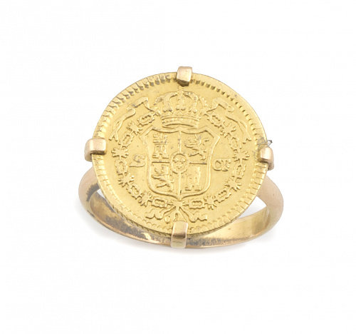 Sortija realizada con moneda de oro de Carlos III en montura de garras de oro amarillo de 18K