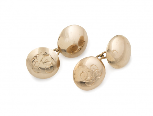 Gemelos dobles en forma de botones semiesféricos, uno de ellos liso, otro con iniciales grabadas