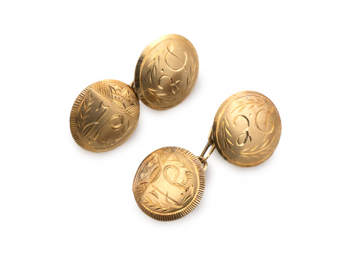 Gemelos dobles en forma de botones semicirculares con iniciales grabadas entre guirnaldas