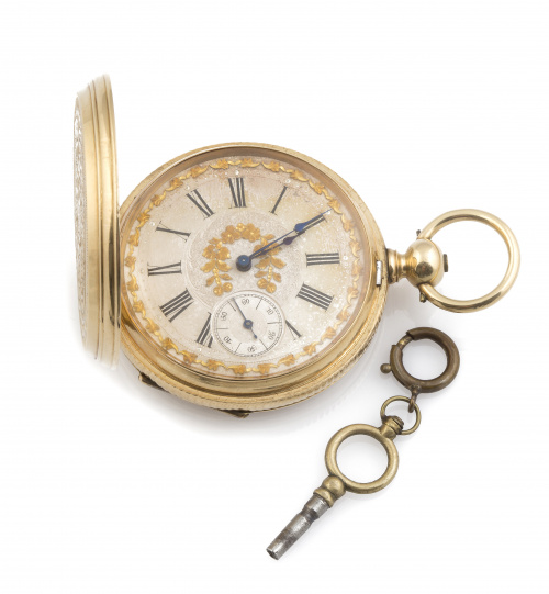 Esfera blanca con decoración floral aplicada en oro. Numeración romana esmaltada en negro y segundero a las seis. Tapas anterior y posterior profusamente grabadas con motivos vegetales y geométricos combinados Mecanismo de cuerda. Se acompaña de llave .Estado de marcha Diámetro: 53 mm.