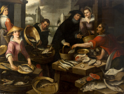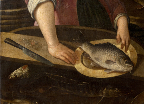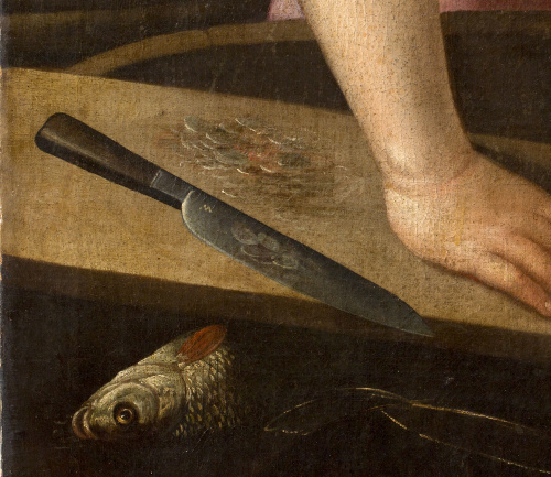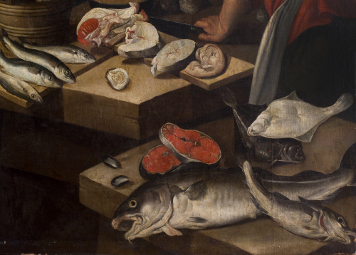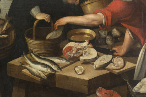 Óleo sobre lienzo. 198 x 258 cm. En la hoja del cuchillo de la parte inferior izquierda, parece leerse una M. Inscrito al dorso nº 565; con etiqueta muy deteriorada al dorso “Colección Ruiz, nº 63” y otra con numeración: “565”. Pintor de bodegones y escenas de género, sus primeros trabajos datan de 1576; en 1581 aparece documentado trabajando en las decoraciones para Margarita de Austria, y en 1594 pintando sus típicos bodegones para el Archiduque Ernesto y para el Conde de Berlaymont, gobernador de Namur. Su peculiar estilo se distingue por la monumentalidad de las figuras, algunas de las cuales repite con cierta frecuencia, equilibrada disposición de los elementos aunque sin excesiva acumulación, en contraposición con otros maestros como Joachim Beuckelaer, y unos fondos arquitectónicos desvaídos, como aclarados.