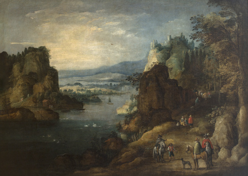 Óleo sobre lienzo. 120 x 168 cm. Con etiquetas de la Junta de Incautación, colección Adanero, nº inv. 7024, y del Colegio Oficial de Arquitectos. Procedencia: Colección Conde de Adanero Por herencia a los actuales propietarios Joos de Momper (Amberes, 1564-1635) se formó con su padre Bartolomeus y en 1594, antes de su breve viaje a Italia donde debió conocer la obra de Ludovico Pozzoserrato, aparece ya trabajando con Cornelis Floris. Para Pérez Preciado, si en sus primeras pinturas pinta abruptas y geométricas montañas, “en estrecha relación con [los trabajos de] Tobias Verhaecht y conceptualmente paralelas a los paisajes montañosos de Pieter Bruegel el Viejo, en las que el aspecto amenazador de la naturaleza queda patente a través de los efectos de luz y el dramatismo general de la escena”, evolucionará hacia “una representación más realista y un interés por la topografía, con un estilo ligero y suelto”, donde los “paisajes montañosos crecen en tamaño y la pincelada se vuelve más suelta, pero continúa con los mismos motivos” (Pérez Preciado, J. J., E.M.N.P, 2006, tomo V, pp. 1569-1570). El lienzo que presentamos sigue muy de cerca la línea del maestro de Amberes: paisaje de carácter simplificado construido con los tres colores típicos de su paleta, marrón, verde y azul, y figuras serpenteando por los caminos, descansando o conversando mientras la luz del atardecer da profundidad a la escena y muestra una amplia gama de tonos matizados.