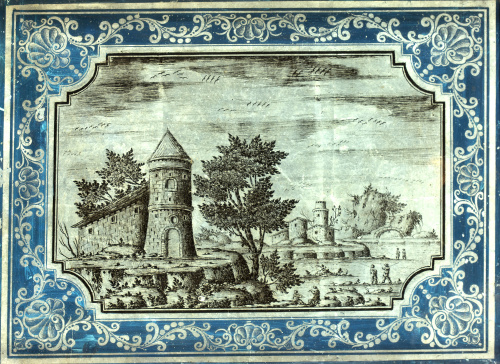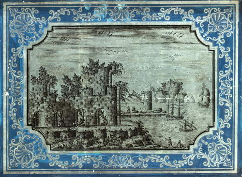 509. ESCUELA ITALIANA, SIGLO XVIIIVistas con paisajes fluviales enmarcados con una cenefa con decoración de conchas y flores de acanto.