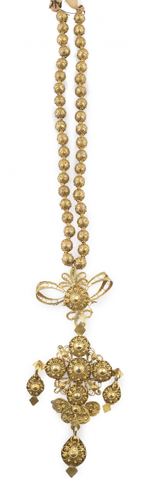 El collar con cuentas esféricas adornadas por filigrana. El colgante con lazo ,cruz y perilla articulados con filigrana en volumen sobre placas. En metal dorado. Los pendientes con botón, lazo y perilla de filigrana de plata dorada. Longitud collar: 34 cm. Longitud colgante: 12,7 cm. Longitud pendientes: 7,3 cm.