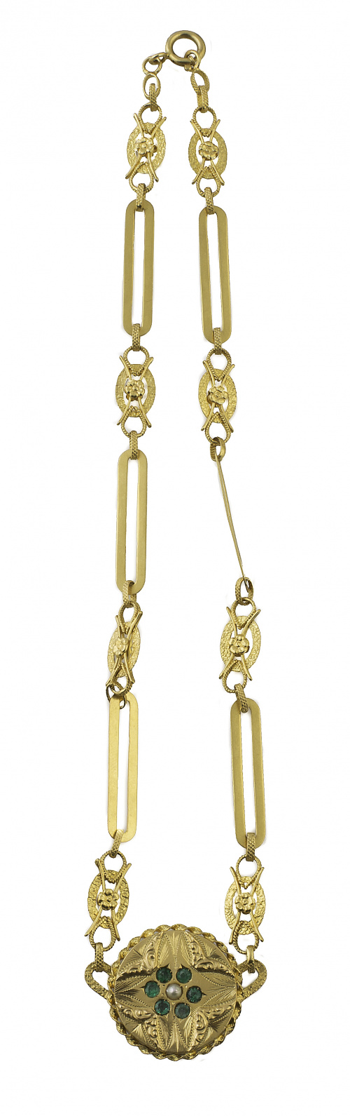 11. Collar portugués de pp. S. XX con centro circular de perla fina orlada de esmeraldas y diseño de flor en relieve