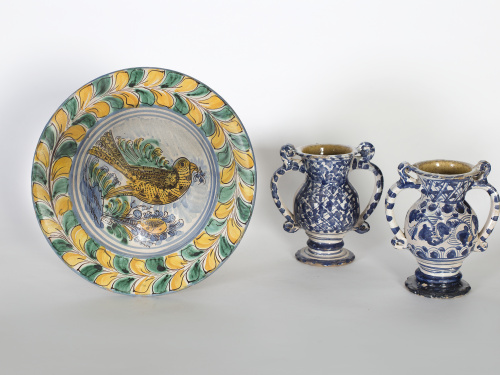 Dos jarritos con asas esmaltados en azul geométrico.Cataluña, S. XVIII..