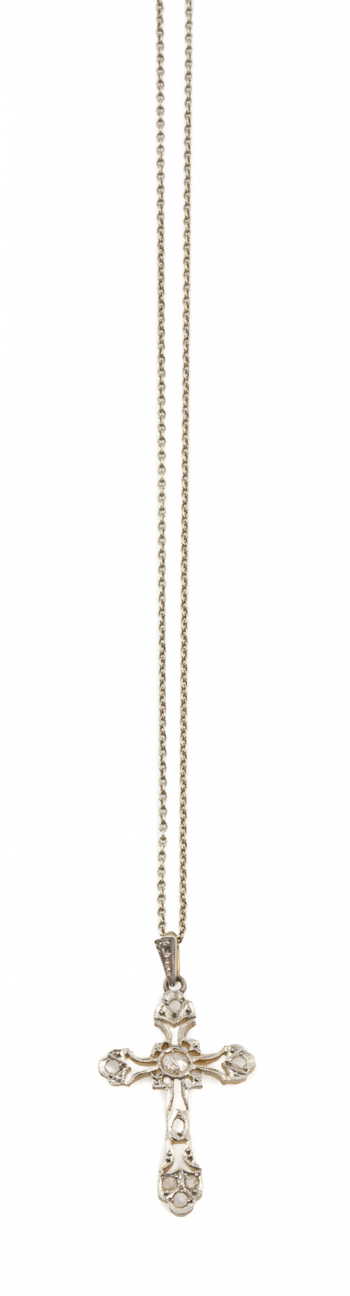 Cruz colgante de diamantes de pp. S. XX con diseño calado, en oro amarillo de 18K con frente y cadena de platino