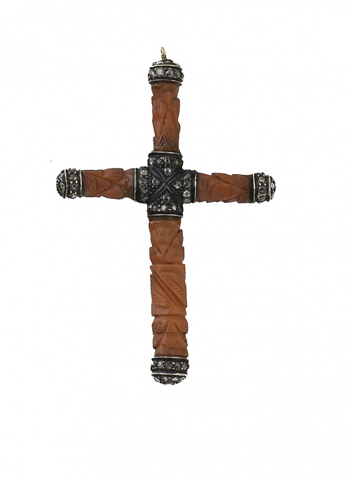 El collar, un hilo sin enfilar de coral mediterráneo facetado de tamaño graduado entre 3,4 y 4,8 mm. La cruz con brazos cilíndricos tallados a modo de tronco de palmera, con motivos de plata y diamantes en centro y remate de los brazos. Longitud collar: 81 cm. Medidas cruz: 5,5 x 3,5 cm.