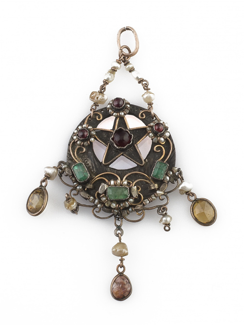 Adornado por granates,esmeraldas y perlas de aljófar. Montura en plata y oro bajo. Longitud: 8 cm.