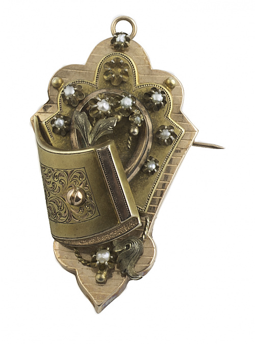 Broche colgante S. XIX en forma de escudo, con diversas formas geométricas y a modo de banda aplicadas con perlitas